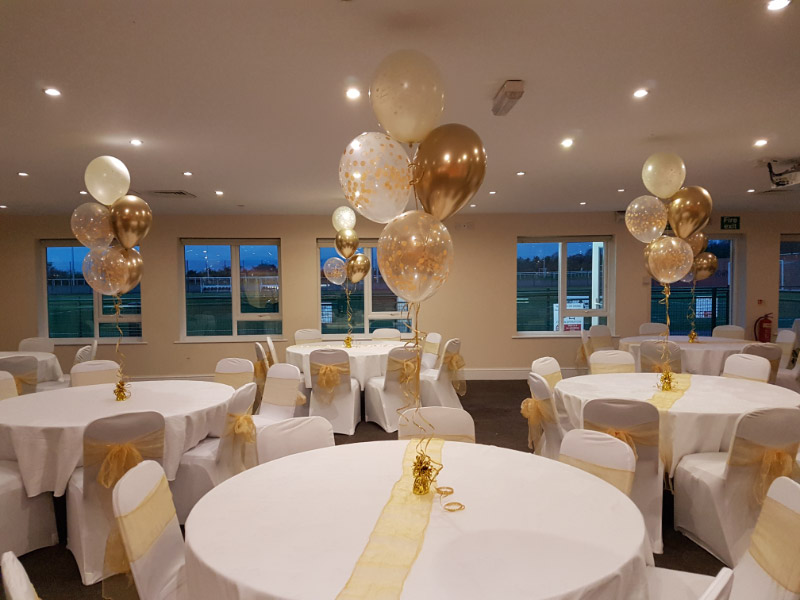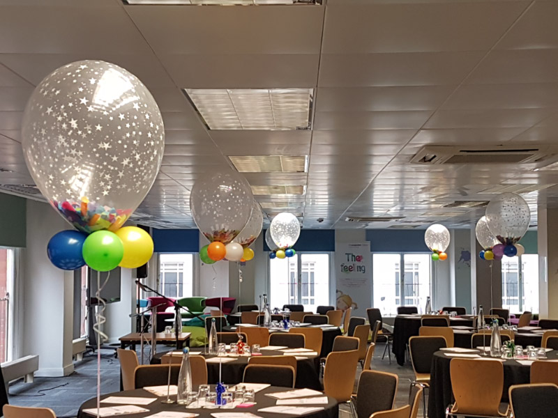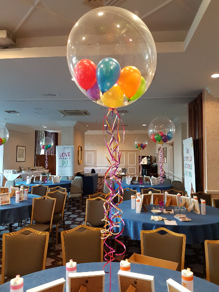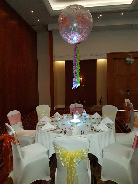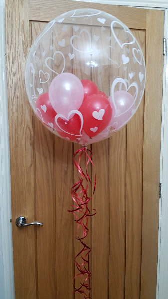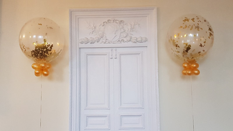 3ft balloons with tulle or ribbon. 3ft confetti filled balloons. New bubble balloons, clear balloons made from a new material that will stay clear and float for days. These can have a normal size latex balloon added inside or several small balloons. Available in clear or with a heart, star, baby footprints or confetti print. These float for up to 2 weeks. Chrome latex balloons. Similar to pearlised latex balloons but with an amazing chrome finish. Available in gold, silver and several other colours.