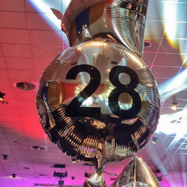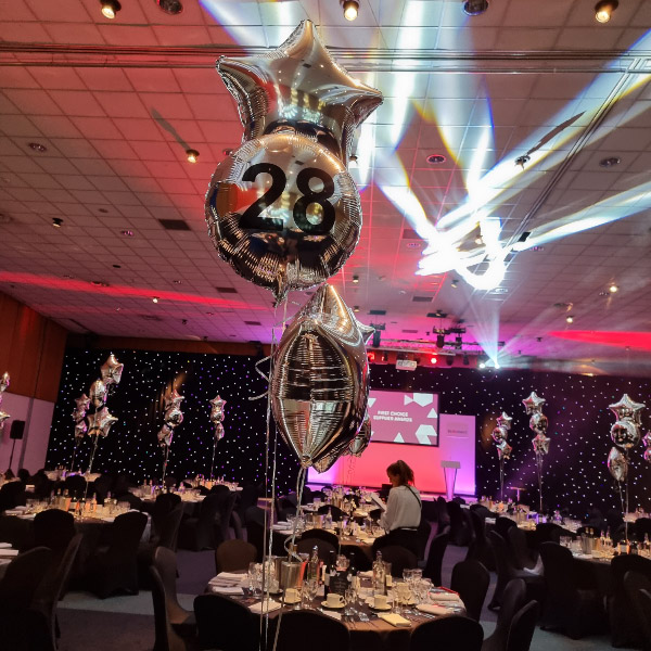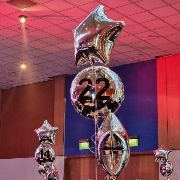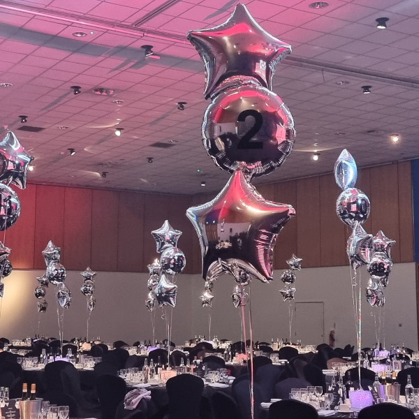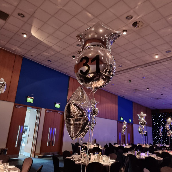 The 18” silver round foil balloons are printed with a large black number on each side of the balloon. We then add two additional balloons, one above and one below to make a set of three.These extra balloons are available in many colours as well as in round, star or heart-shaped so if you have a colour scheme then we can try and match this for you. We can also add the table number balloons to the top of sets of latex balloons.