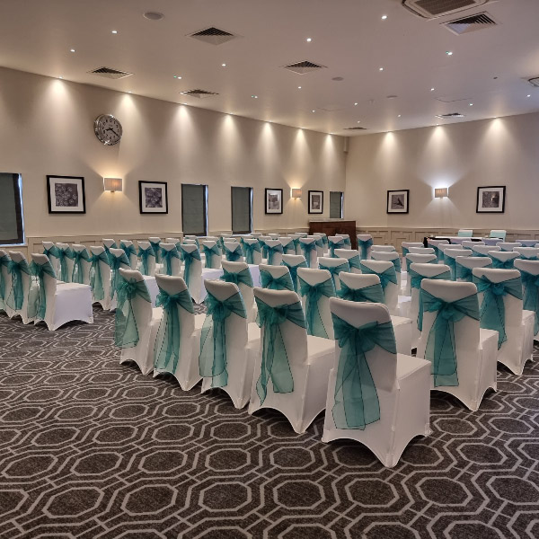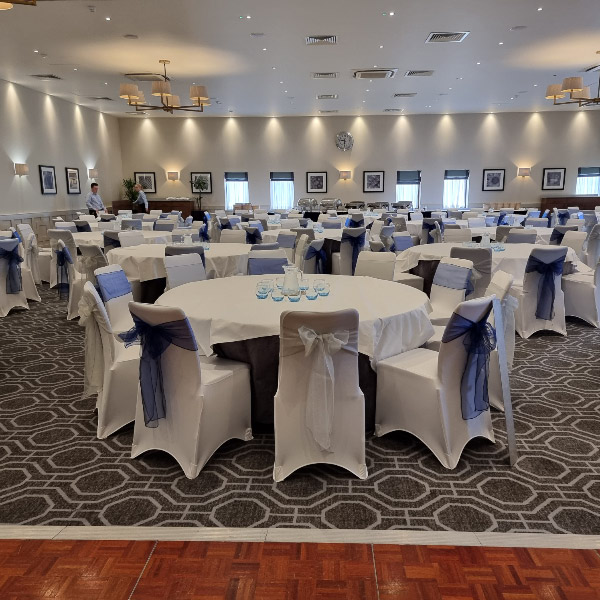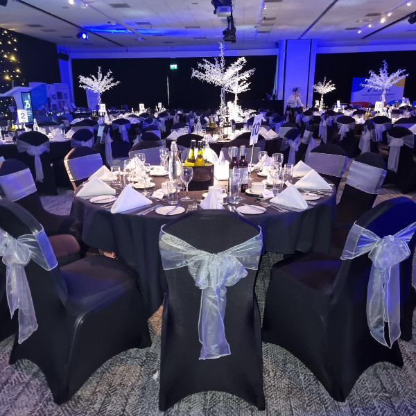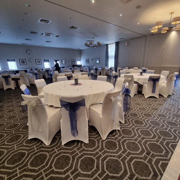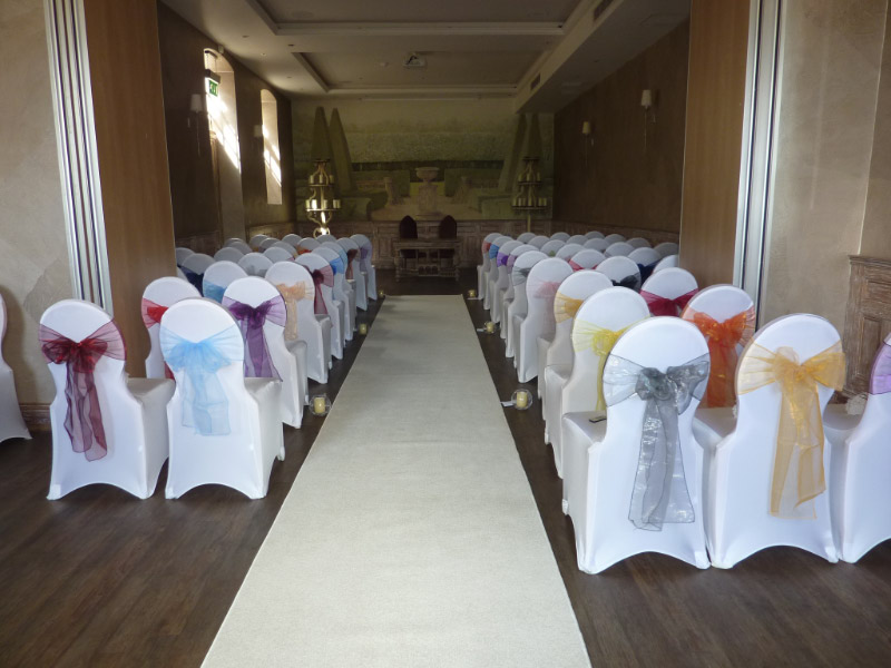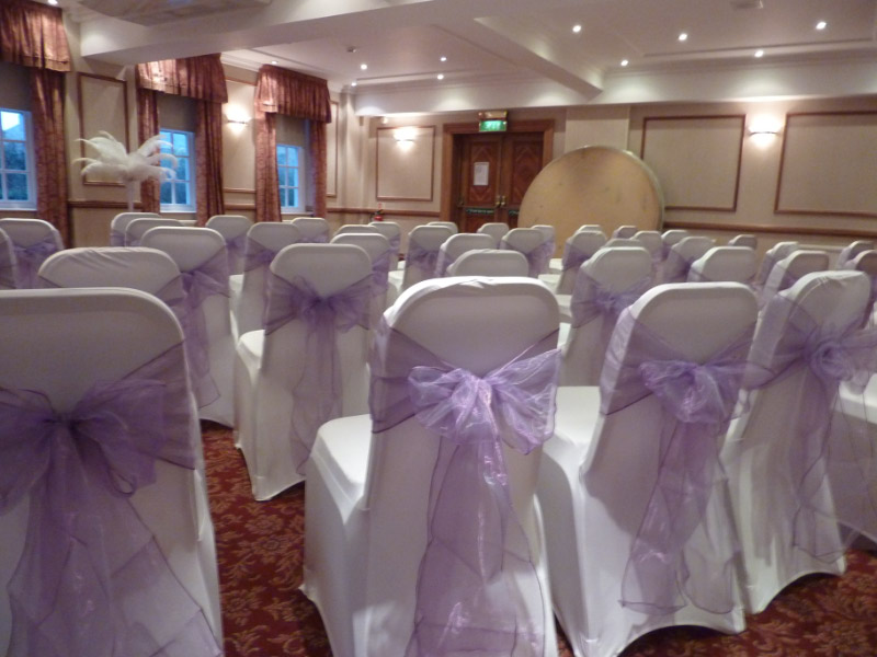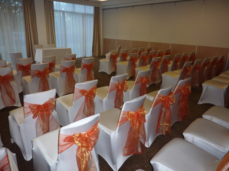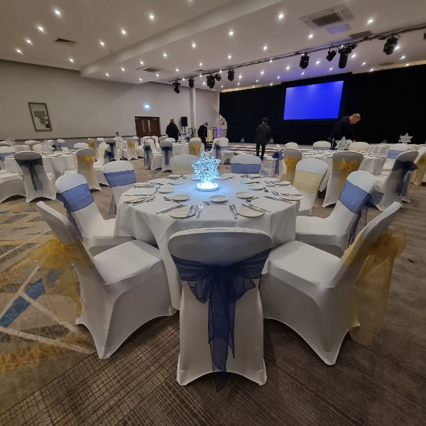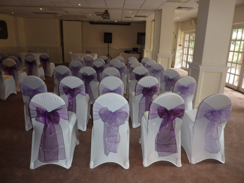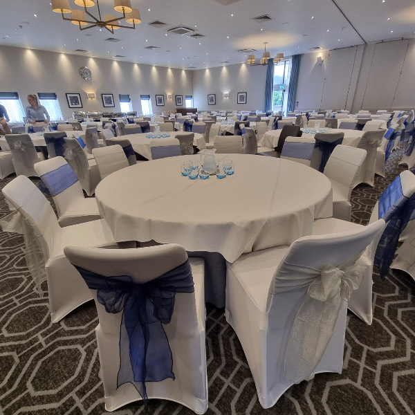 We are able to hire or hire and fit large numbers of stretch chair covers locally and nationally for larger events with or without sashes or chair bands.