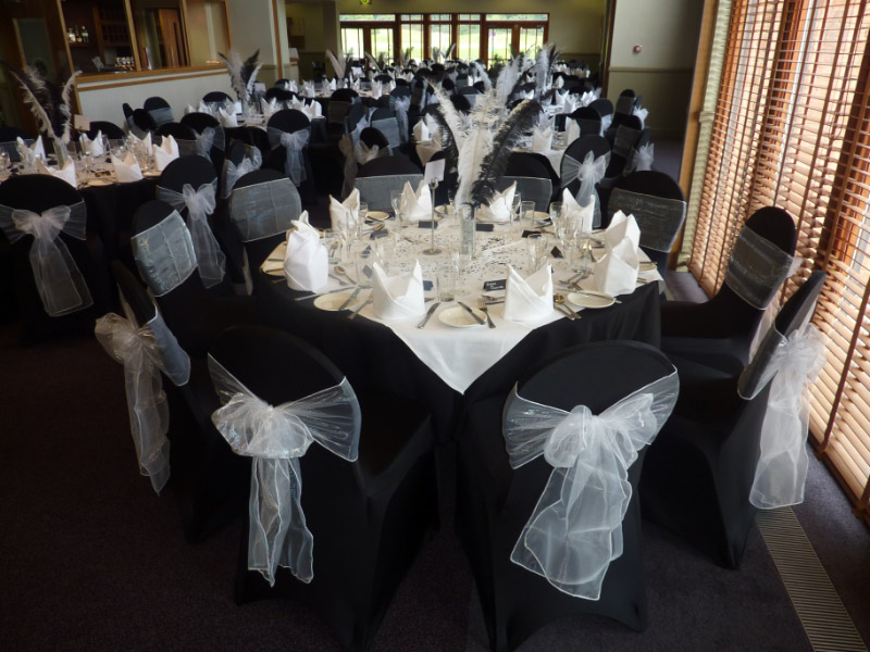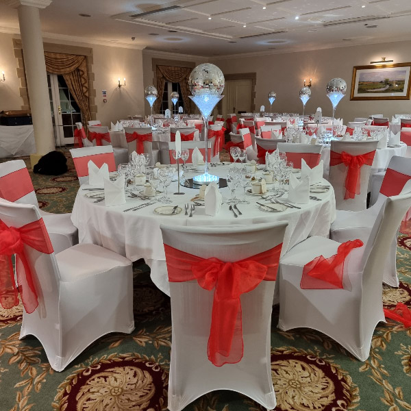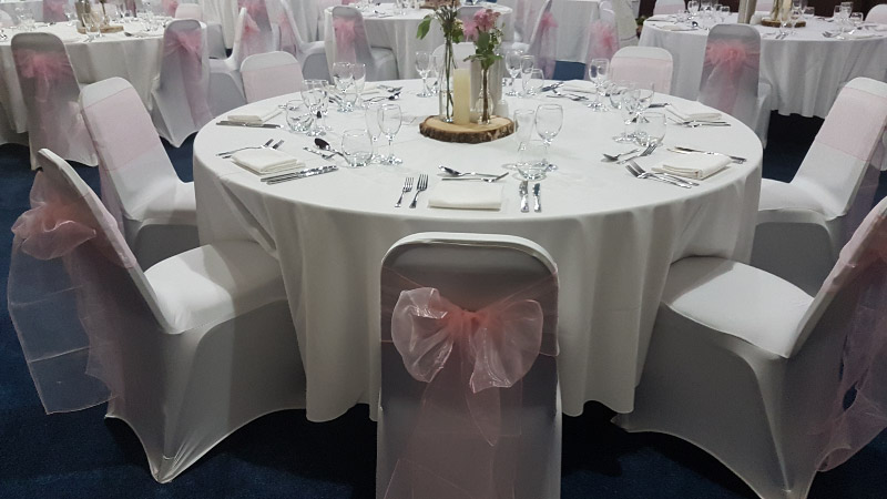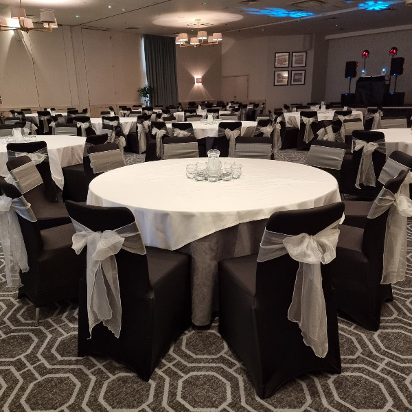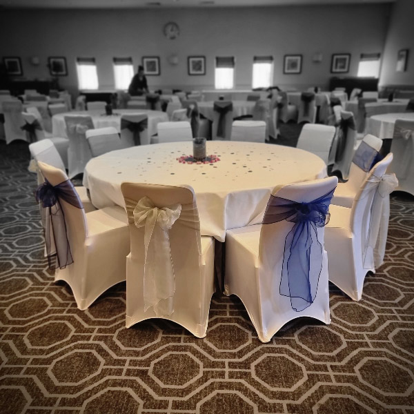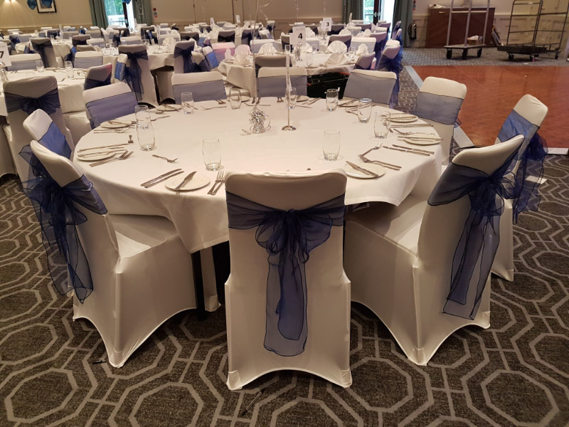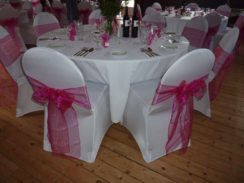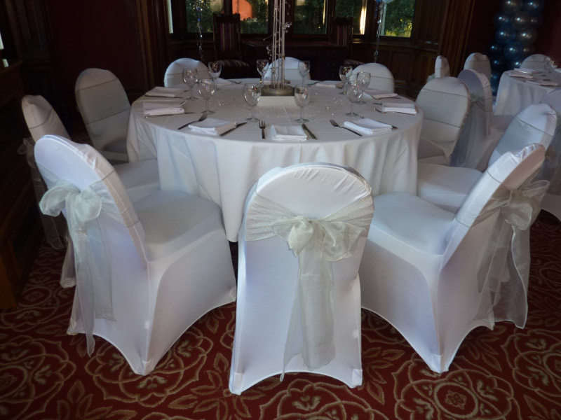 For the perfect fit our chair covers which will stretch to fit most chairs. Eliminate those unsightly creases seen on poor quality or badly fitting chair covers. Choose from white, black, zebra, chequered flag or different colour chair covers. We will fit your chair covers and add organza sashes or stretch bands. All of our chair covers are owned by us and professionally laundered and organza chair sashes are ironed before each event.