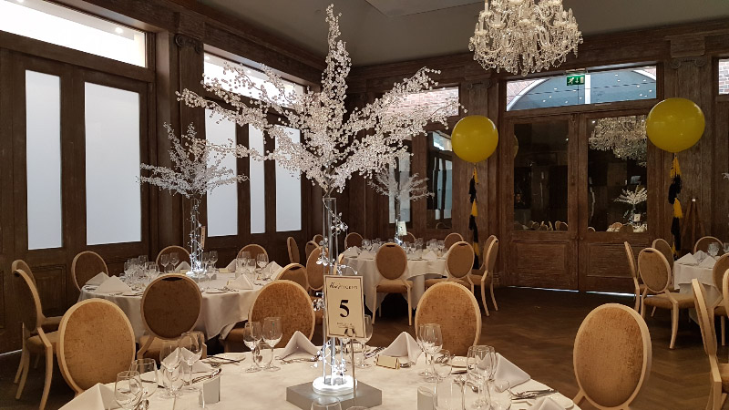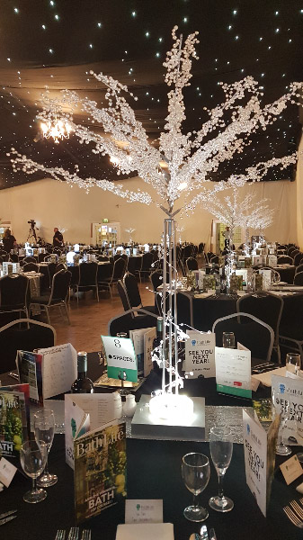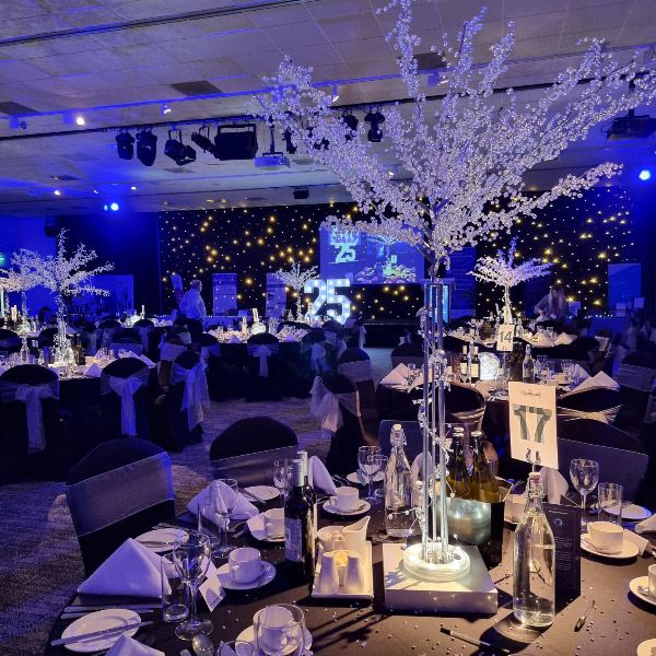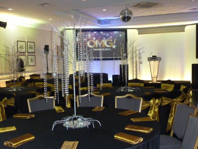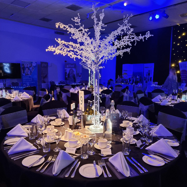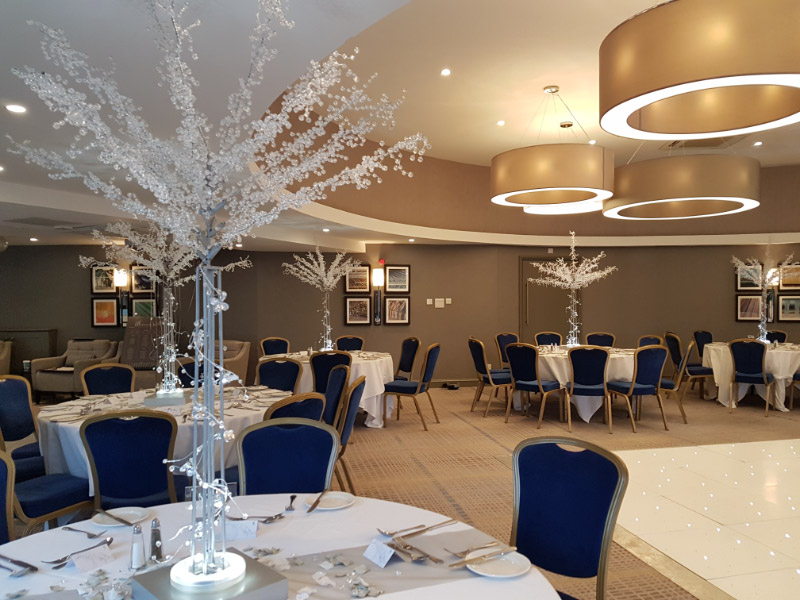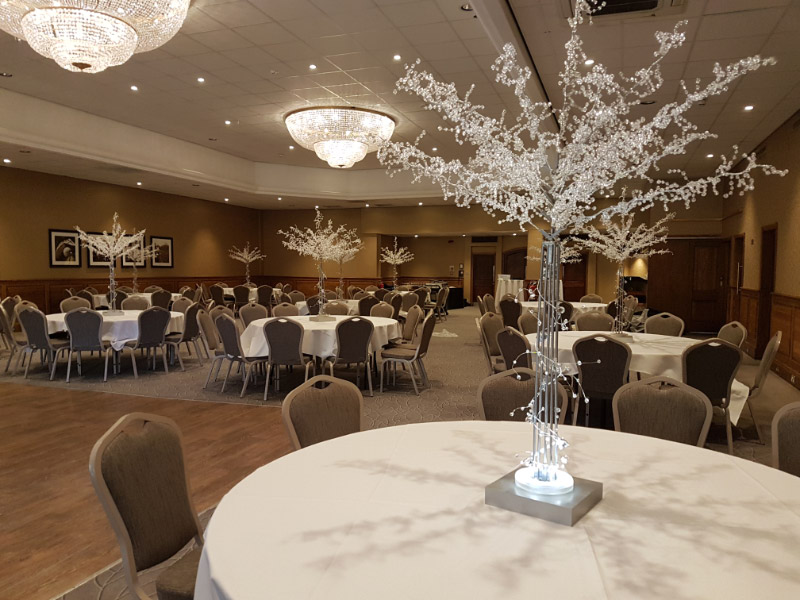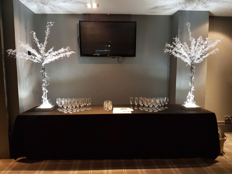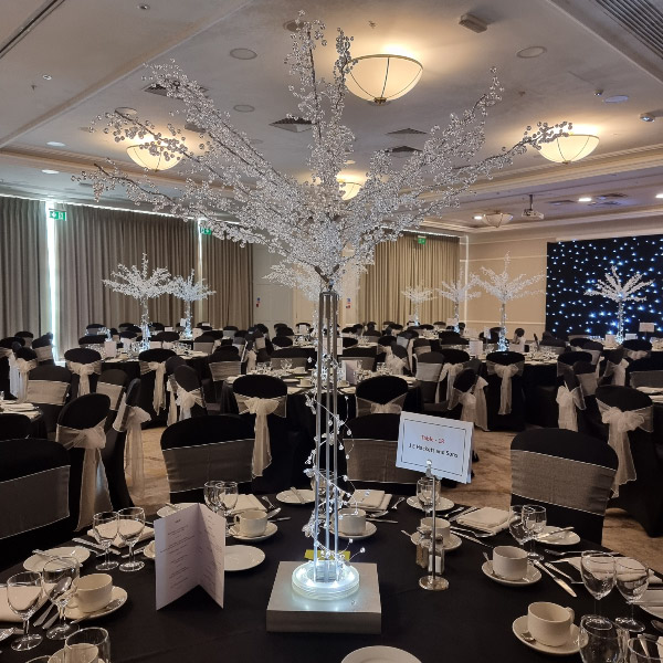 Our beautiful crystal tree table centrepieces and are available to hire. They are silver in colour and stand 1.2 metres tall. The crystal trees will add a real wow factor to your party, wedding or event. Our silver crystal trees are covered in hundreds of crystal beads, we then wrap the tree trunk in crystals and up light it with LED lighting for a dazzling effect. We also have some gold manzanita trees that are decorated with hanging crystals and these are also illuminated with LED lights.