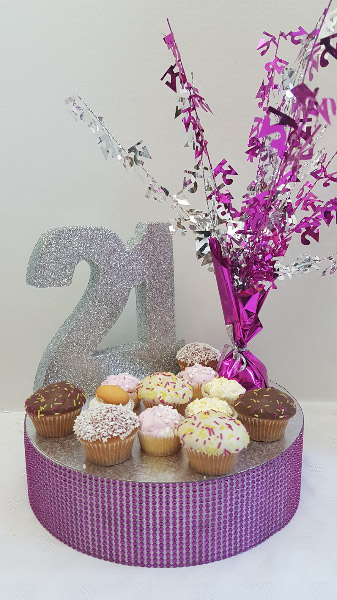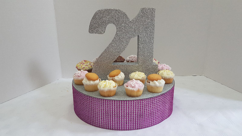 Choose your colour of diamantes to go around the edge of either a 10 or 12 inch circular riser. The top can be left as a plain silver board suitable to add a cake or cupcakes that can be wiped clean or we can add a glittered top in your choice of colour.