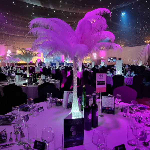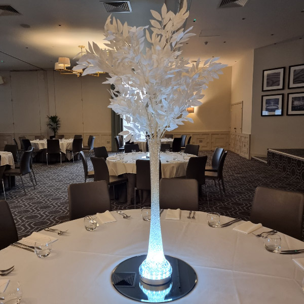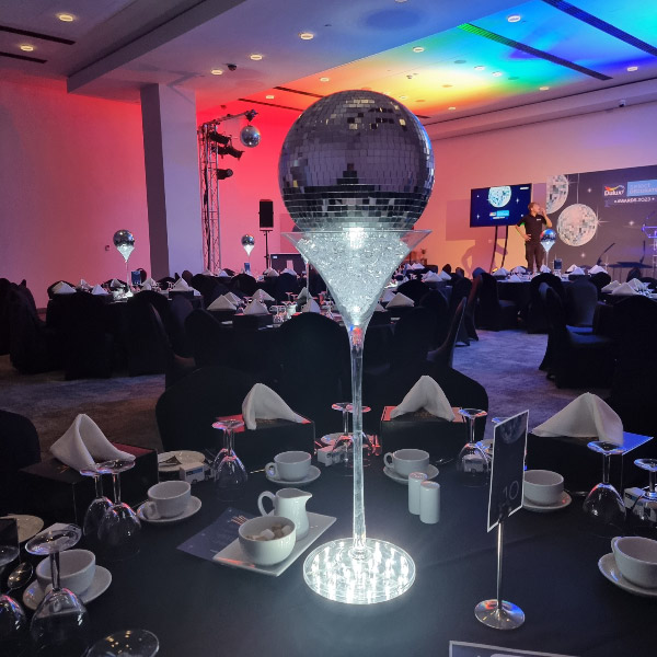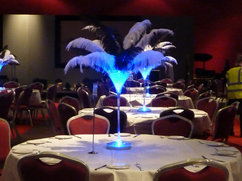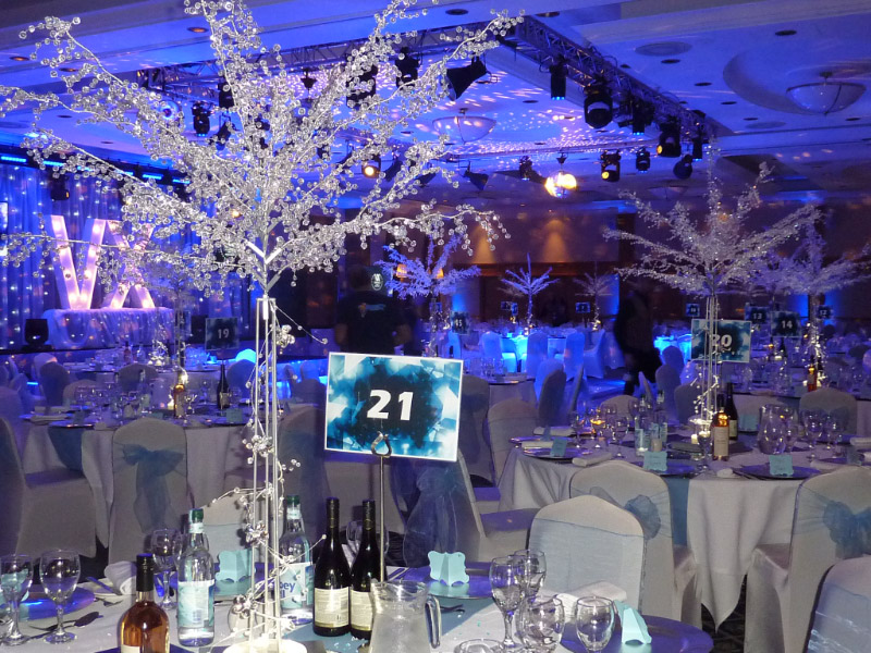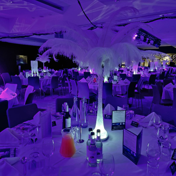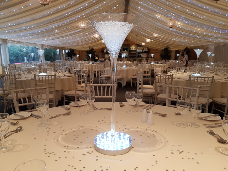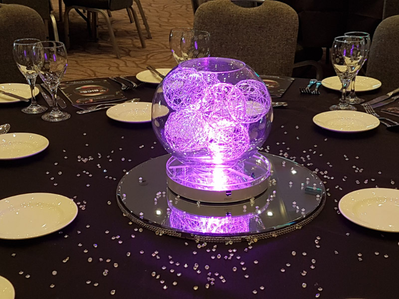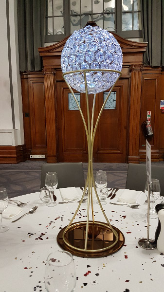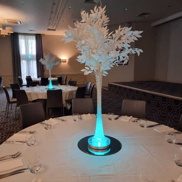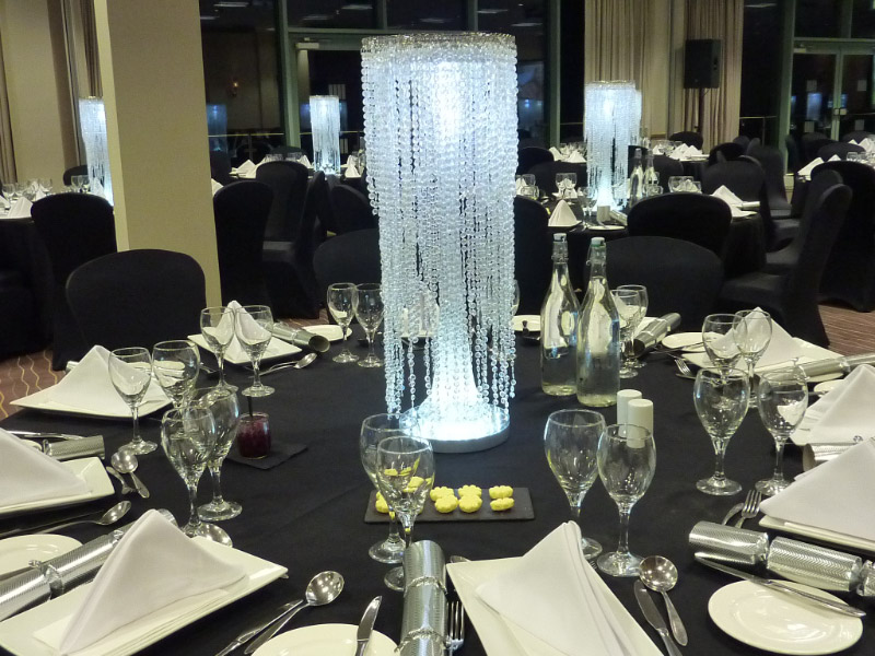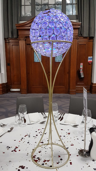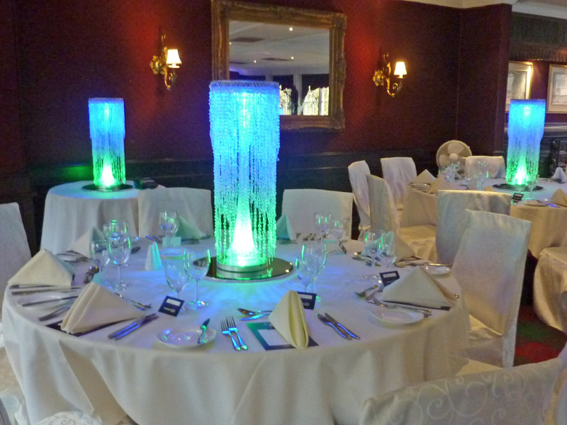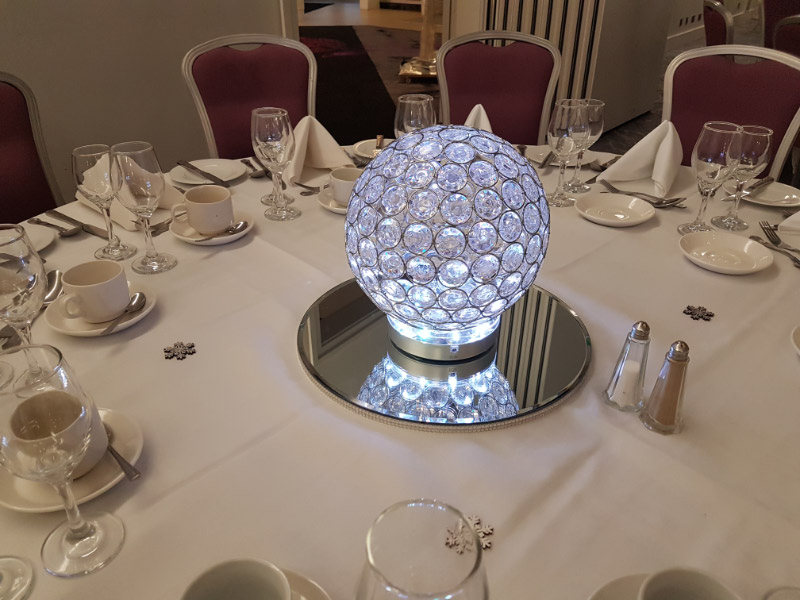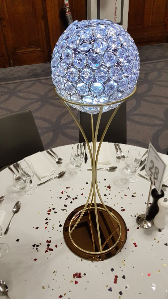 Choose from a range of tall centrepieces such as our crystal trees with uplighting, ostrich feather displays in lily vases or martini vases, mirrorball centrepieces, crystal table chandeliers and crystal candleabras. If you are looking for a lower table centrepiece then choose from our bubble bowls filled with silver wire balls which can then be illuminated in many different colours, crystal balls, moon balls, crystal cones and our star lamps.