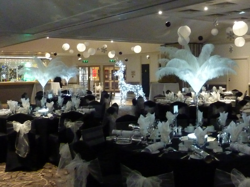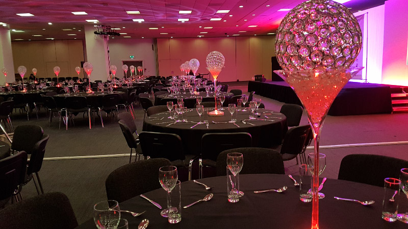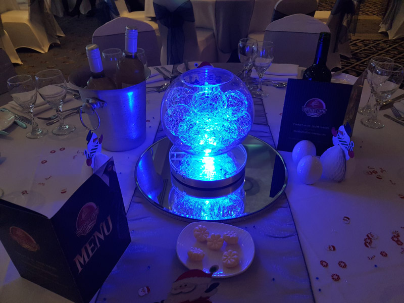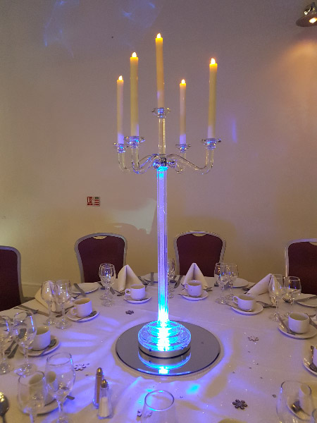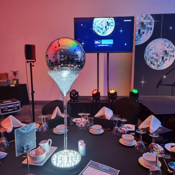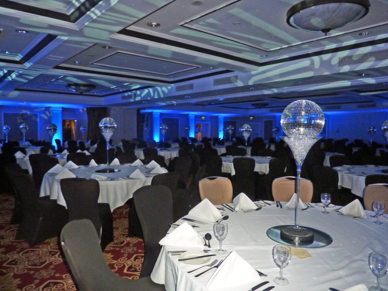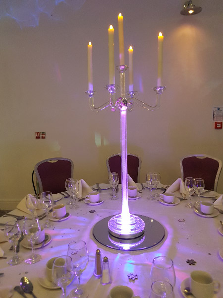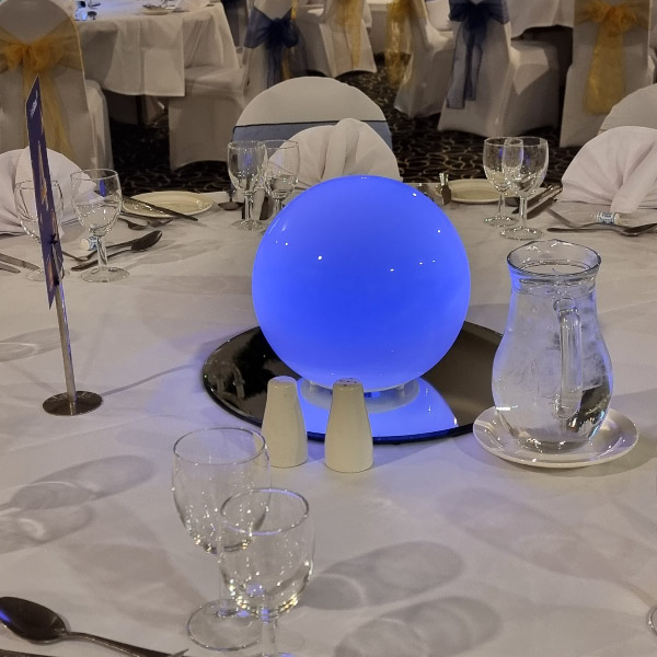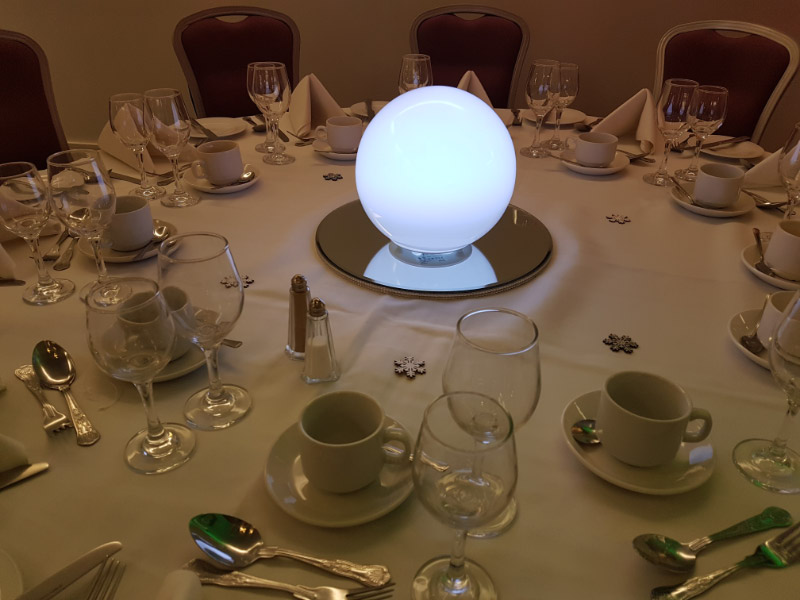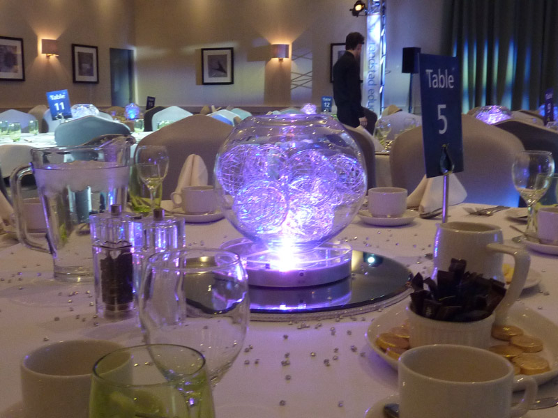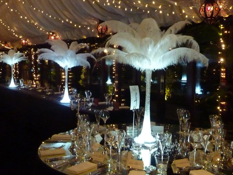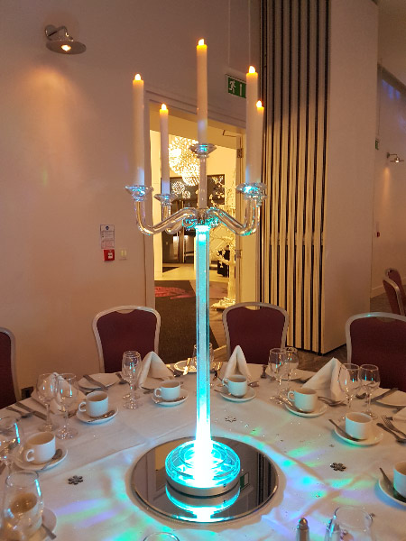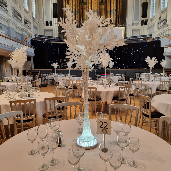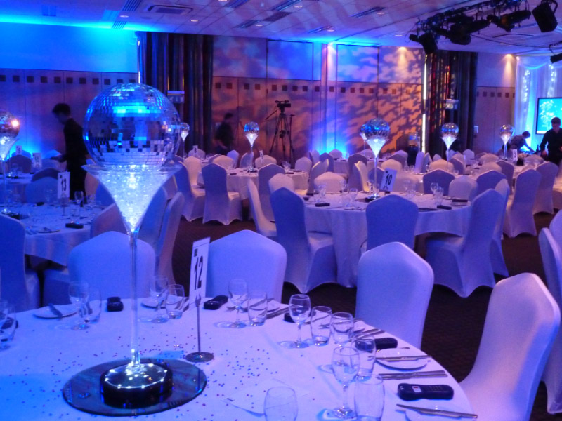 Choose from a range of tall centrepieces such as our crystal trees with uplighting, ostrich feather displays in lily vases or martini vases, mirrorball centrepieces, crystal table chandeliers and crystal candleabras. If you are looking for a lower table centrepiece then choose from our bubble bowls filled with silver wire balls which can then be illuminated in many different colours, crystal balls, moon balls, crystal cones and our star lamps.