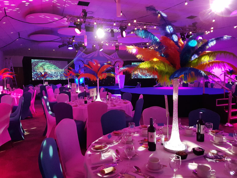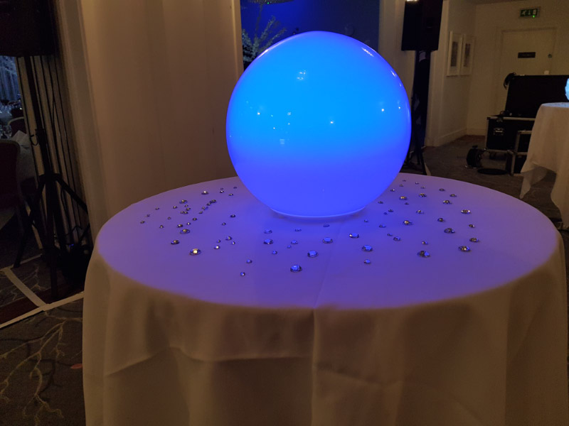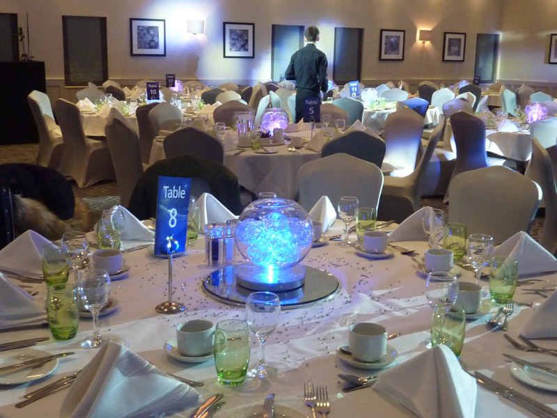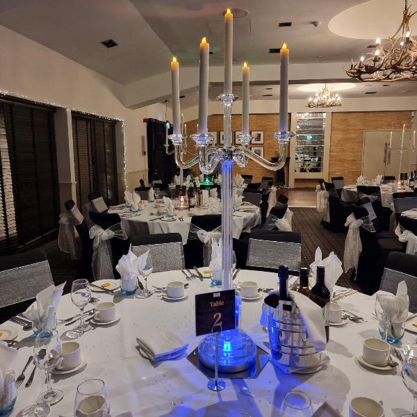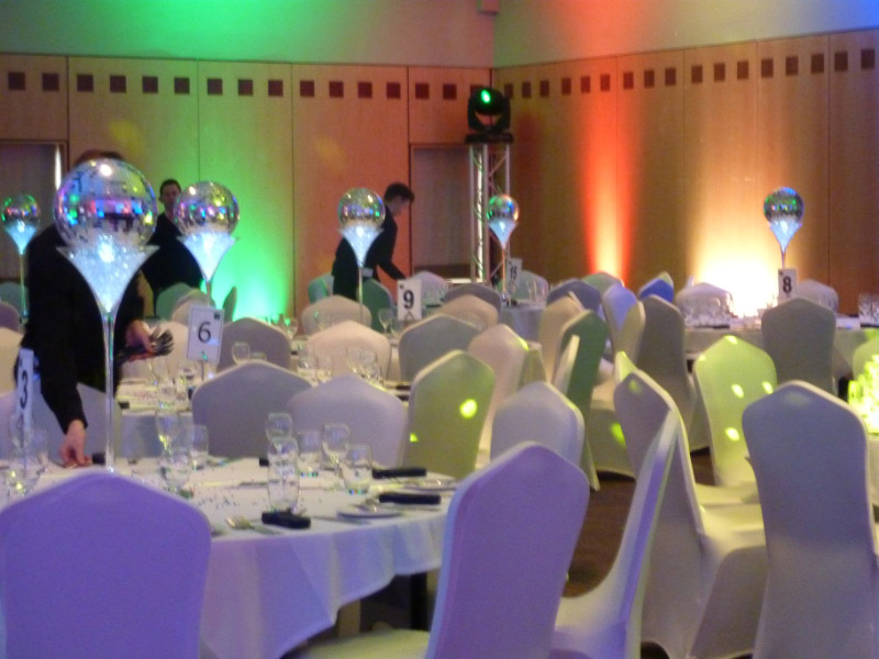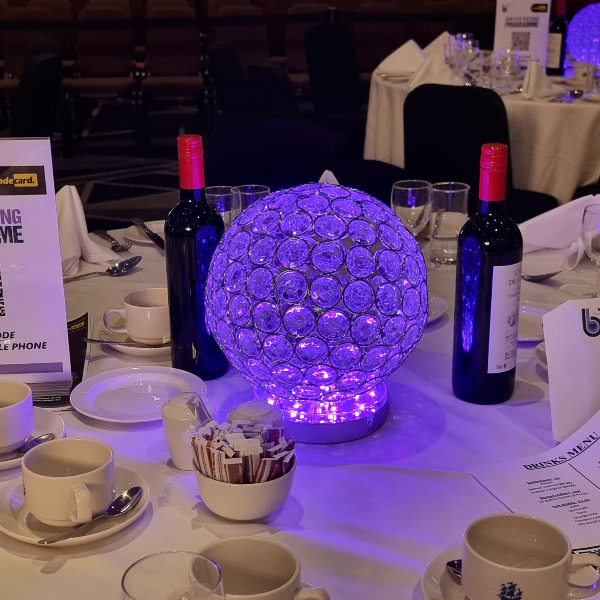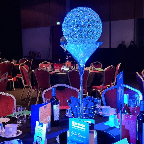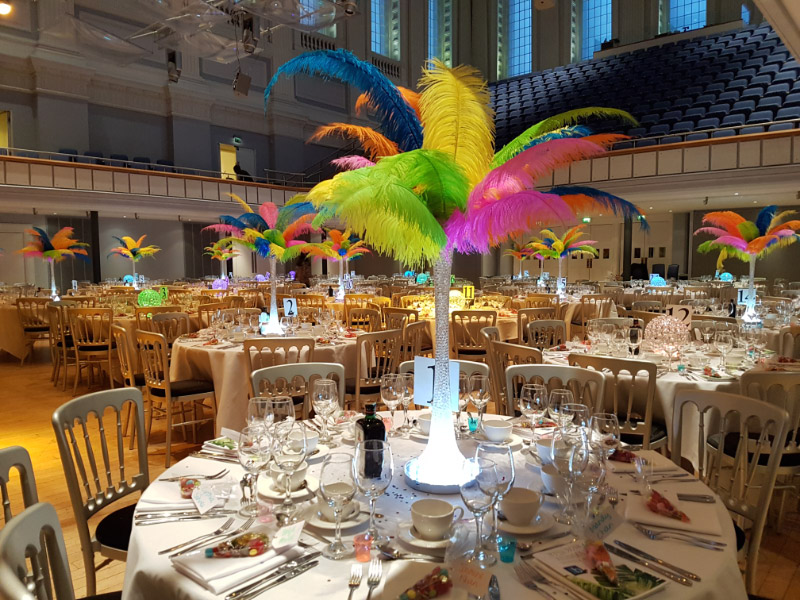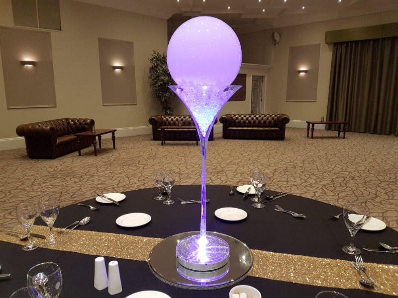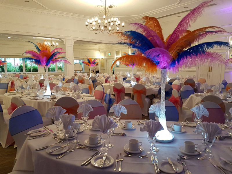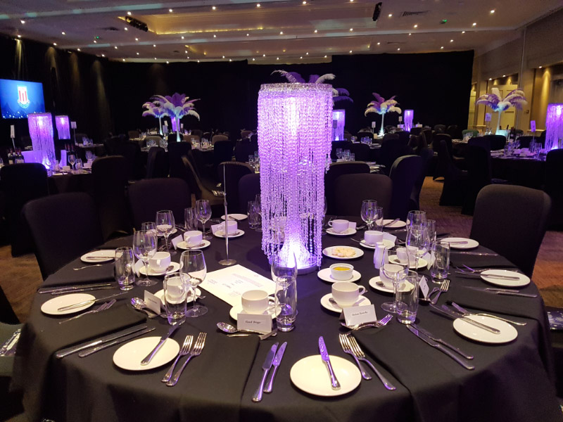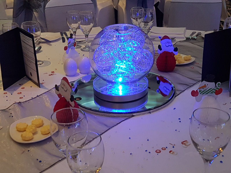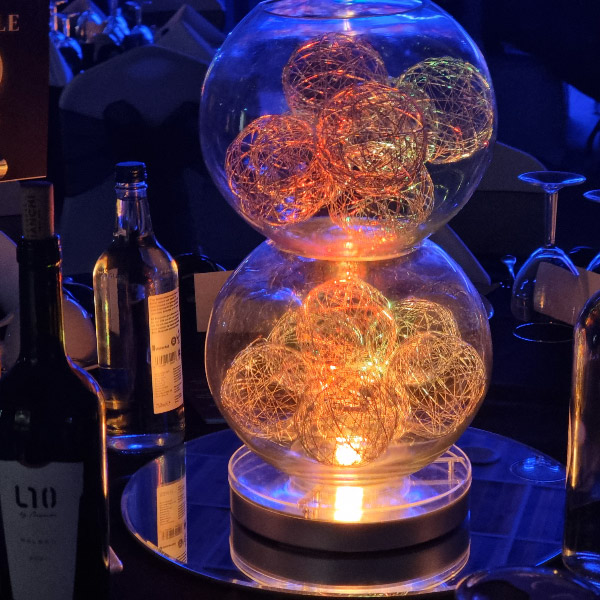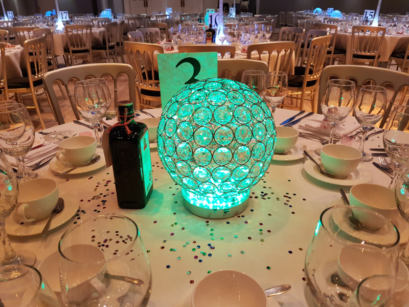Choose from a range of tall centrepieces such as our crystal trees with uplighting, ostrich feather displays in lily vases or martini vases, mirrorball centrepieces, crystal table chandeliers and crystal candleabras. If you are looking for a lower table centrepiece then choose from our bubble bowls filled with silver wire balls which can then be illuminated in many different colours, crystal balls, moon balls, crystal cones and our star lamps.