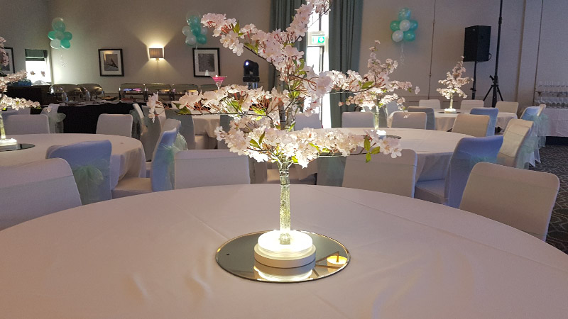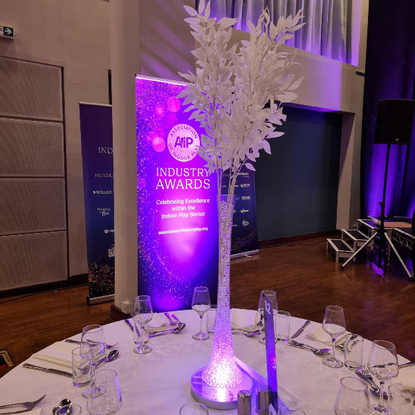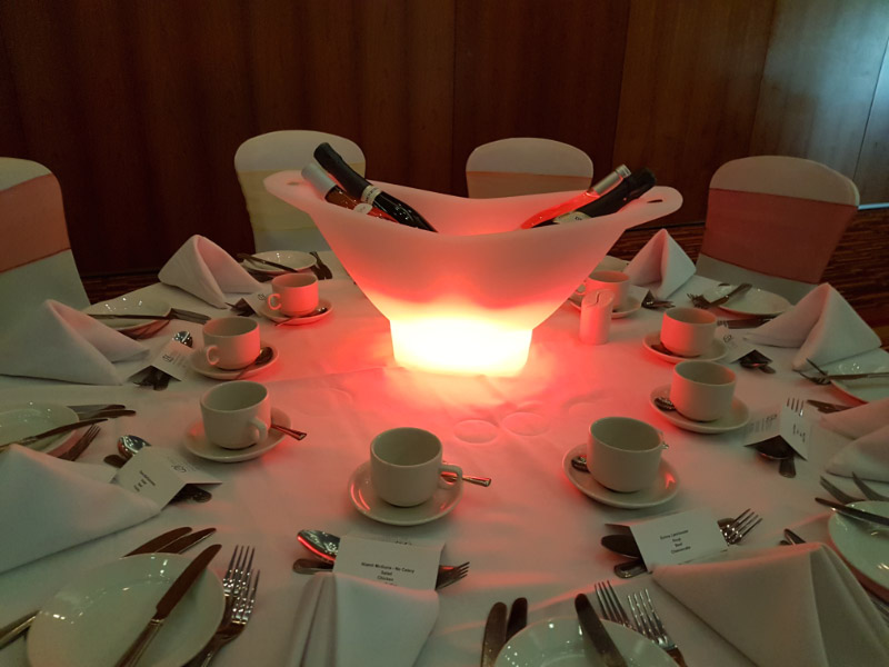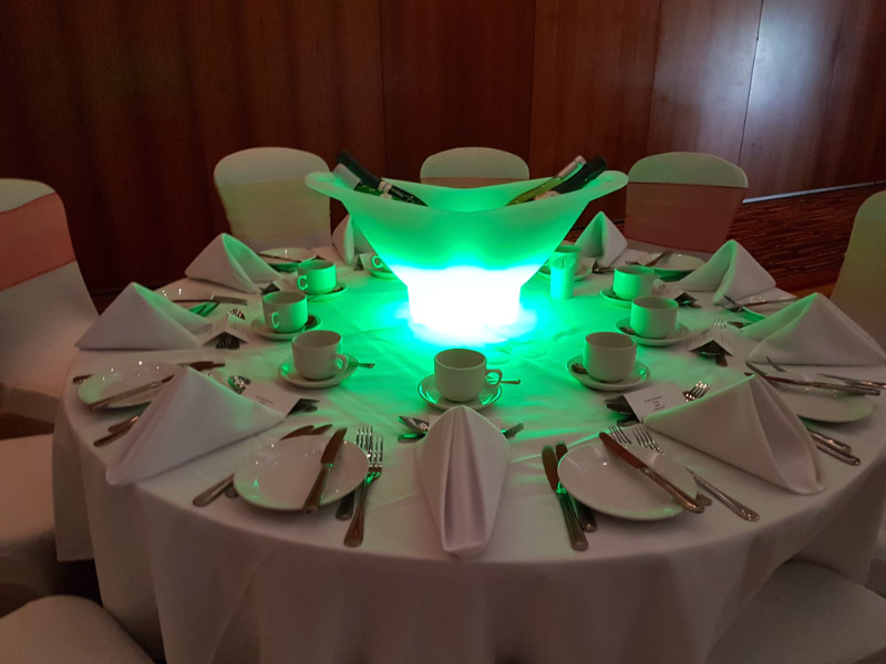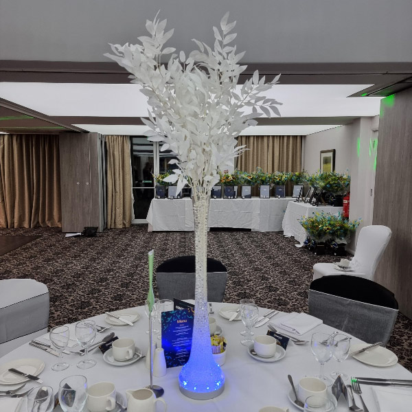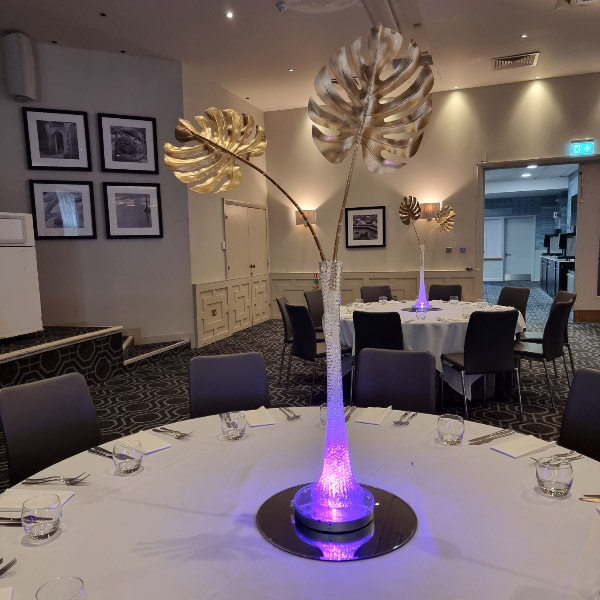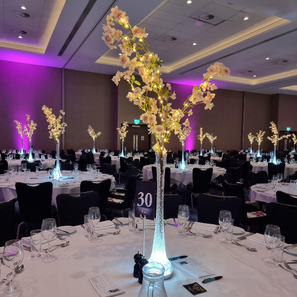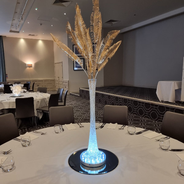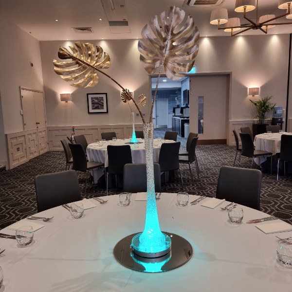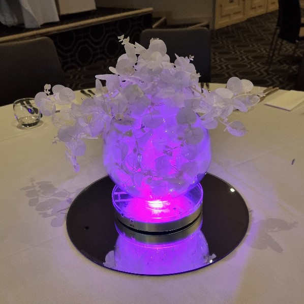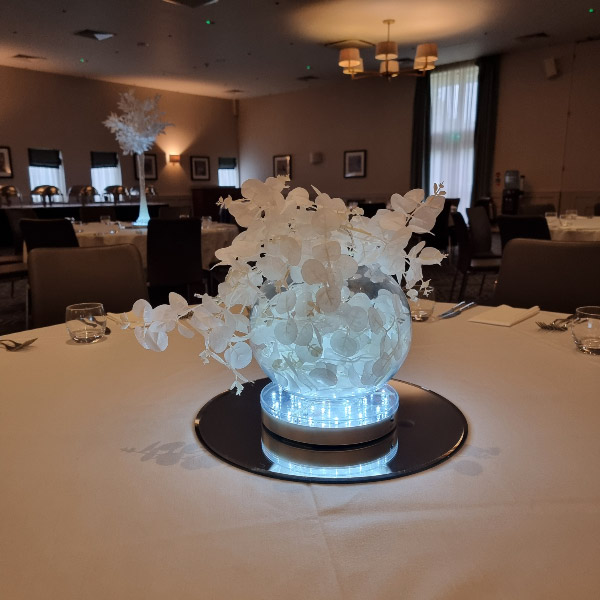 Welcome to our new range of LED centrepieces for hire. These will transform your event and achieve a real wow factor. Our LED lights can be programmed to your colour scheme and can be either static, fading slowly or quickly or flashing. Alternatively our white LED light bases will light up our vases and make your centrepieces really glow. Why not also book one of our Starlight backdrops which can also have the inbuilt lights adjusted to different colours.