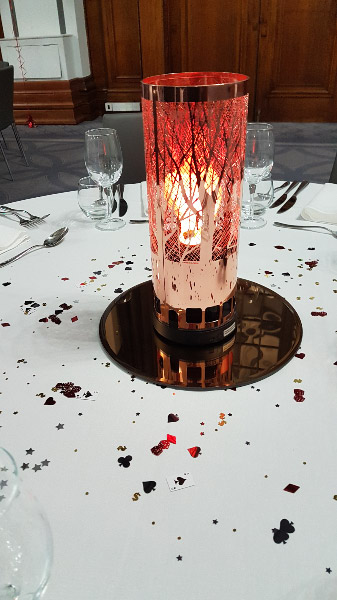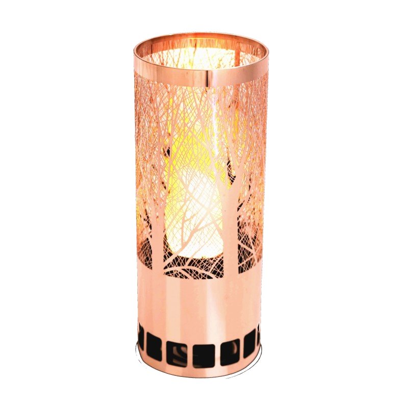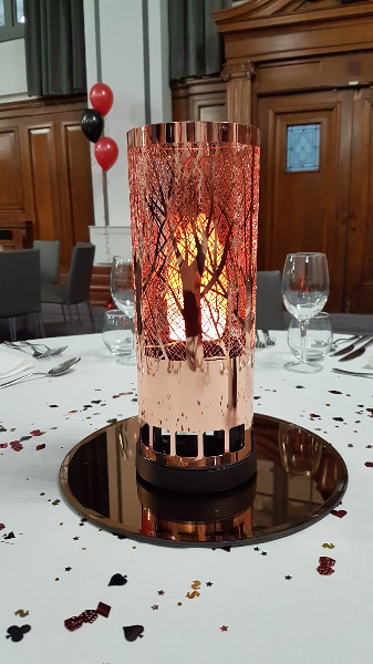 Now available - New table centrepiece flame lamps with real silk flickering flame that looks good enough to be real within a copper forest design lamp. See gallery for photo or call us for more information.