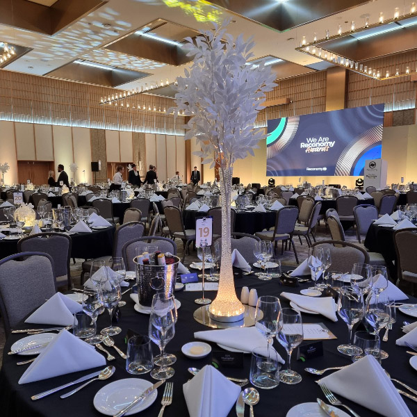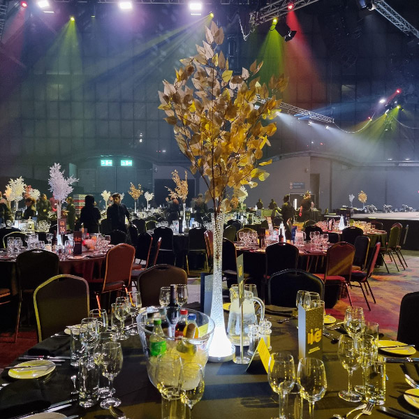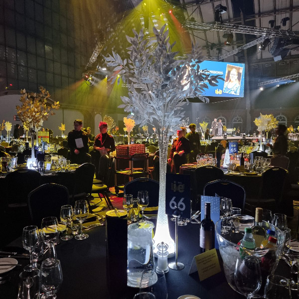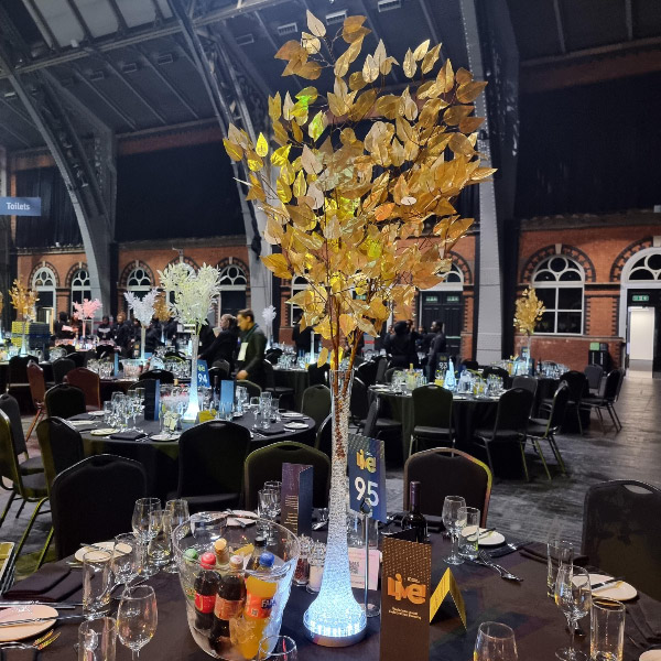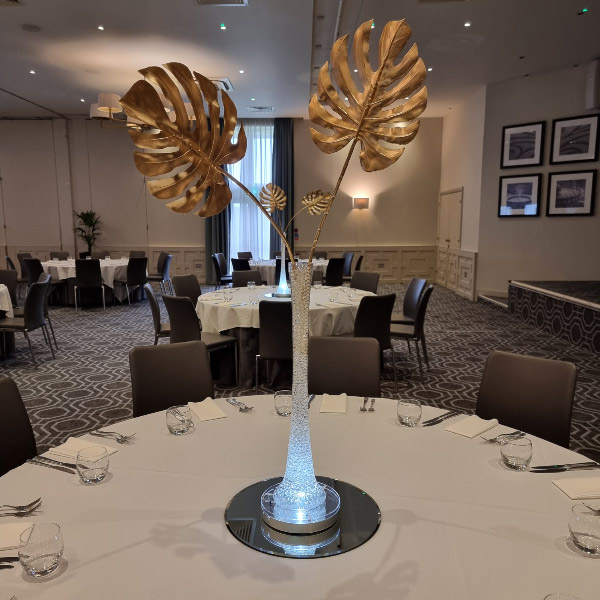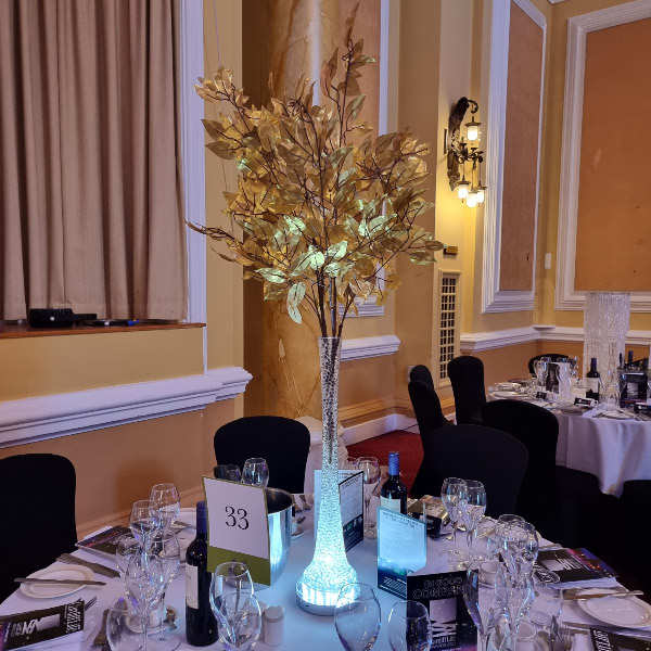 NEW - Glitter twig centrepieces in champagne, red or ice, ideal for fire and ice themed parties or other events. Also new illuminated white leaf tree centrepiece, gold leaf trees and tropical leaf centrepieces.